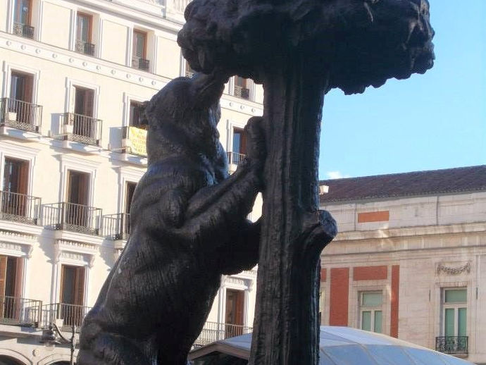 The Bear and the Strawberry Tree. July 2014 The Puerta del Sol (English: "Gate of the Sun") is a public square in Madrid, one of the best known and busiest places in the city. This is the centre (Km 0) of the radial network of Spanish roads. The square also contains the famous clock whose bells mark the traditional eating of the Twelve Grapes and the beginning of a new year. The New Year's celebration has been broadcast live since 31 December 1962 on major radio and televisi